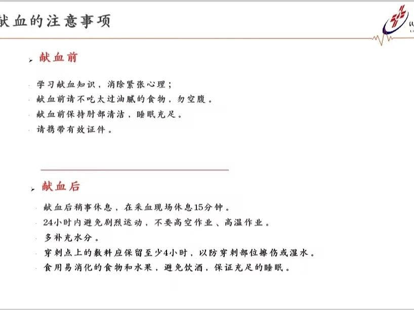 了解权益的同时,也继续讲述了献血的好处。卢星宇说明,献血不仅是挽救他人生命的崇高行为,也是一次免费的健康检查,更能促进自身新陈代谢;为了让大家能够安全、顺利地参与献血,详细介绍了献血条件与流程。他讲解了献血的基本条件,如年龄、体重和健康状况要求,并梳理了从登记到采血的完整步骤,帮助师生消除顾虑;最后,讲座贴心地给出了献血的注意事项。卢星宇特别提醒大家,献血前不宜空腹或食用油腻食物,献血后则需要注意休息、补充水分并避免剧烈运动,确保整个过程的健康与安全。