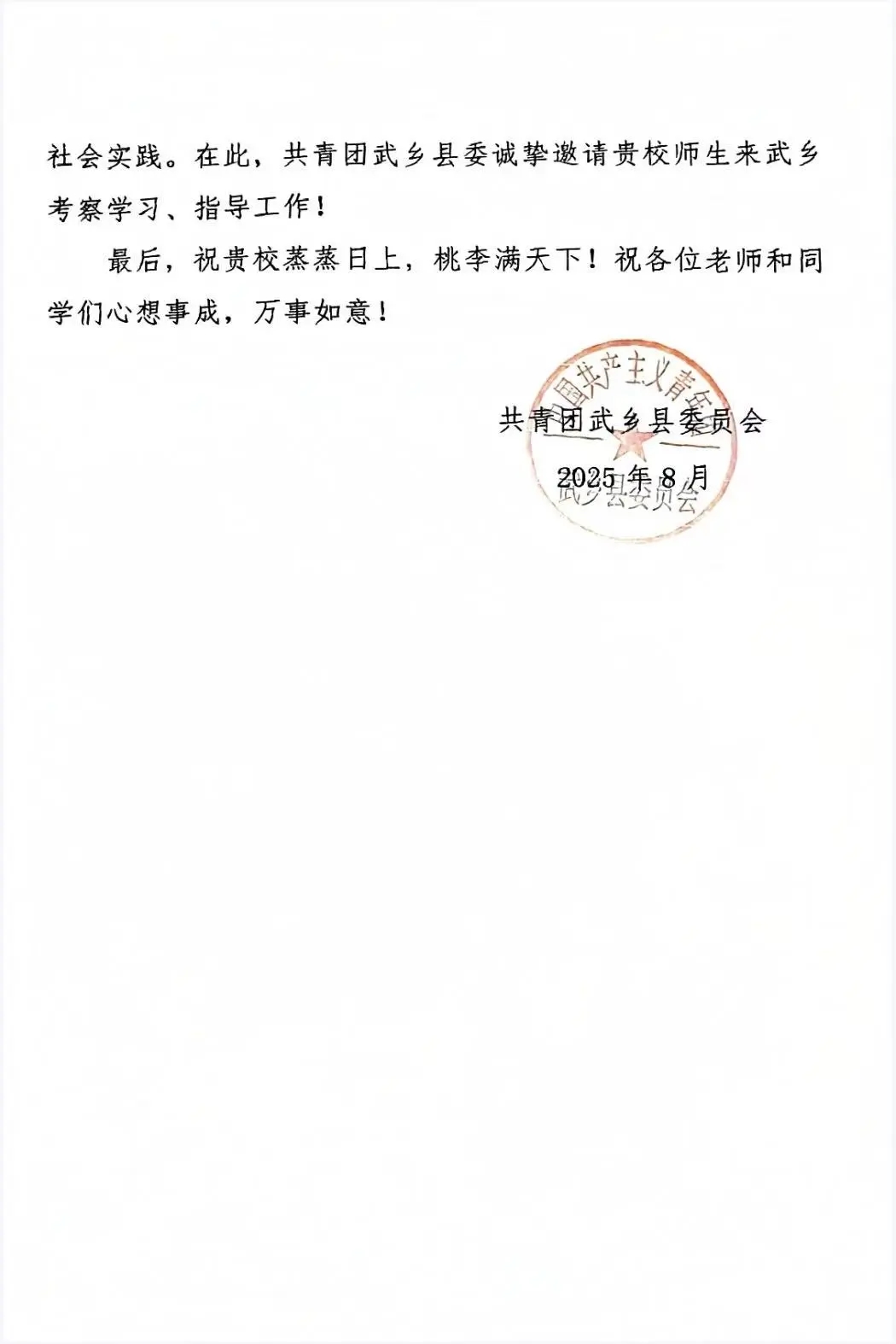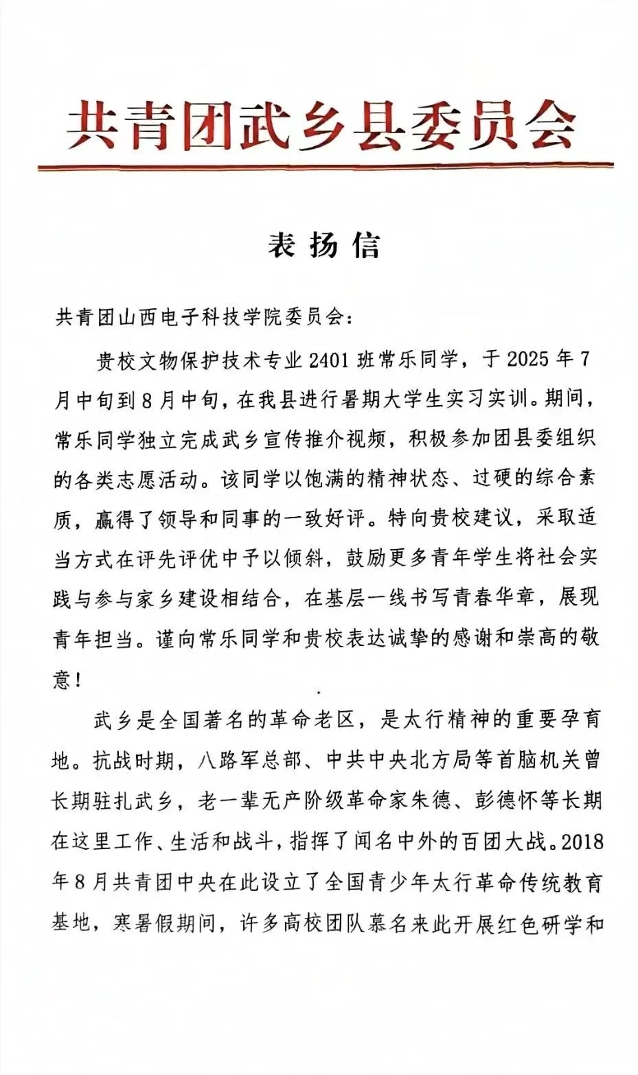 近日,武乡县委向我校团委发来一封表扬信。信中对我校文物保护技术专业2401班常乐同学在暑假期间志愿活动中的优秀表现予以表扬和感谢。