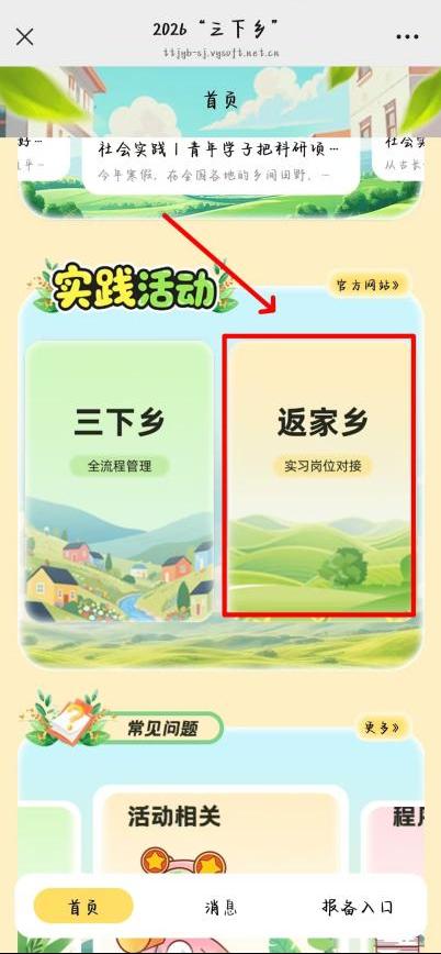 1.返家乡社会实践活动:在“创青春”微信公众号的“社会实践”栏目入口登录“2026三下乡”—“返家乡”,按分类、区域搜索岗位信息,确认选择合适的岗位后,填报并提交报名信息,等待审核和系统提示信息,按信息指示开展后续操作。通过双向选择方式录取。(见附件二)。