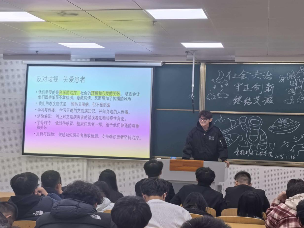 为全面提升同学们对艾滋病的深刻认知与有效防范能力,同时进一步强化同学们在日常生活中对艾滋病患者的反歧视意识。智能制造工程学院团委于11月16日在南楼318举办了“社会共治,守正创新,终结艾滋”宣讲竞赛。选手围绕防艾知识,反歧视理念展开宣讲。此次活动,不仅帮助同学们树立了科学健康观念,更引导大家以实际行动关爱艾滋病人,助力营造包容友善的学校氛围。
