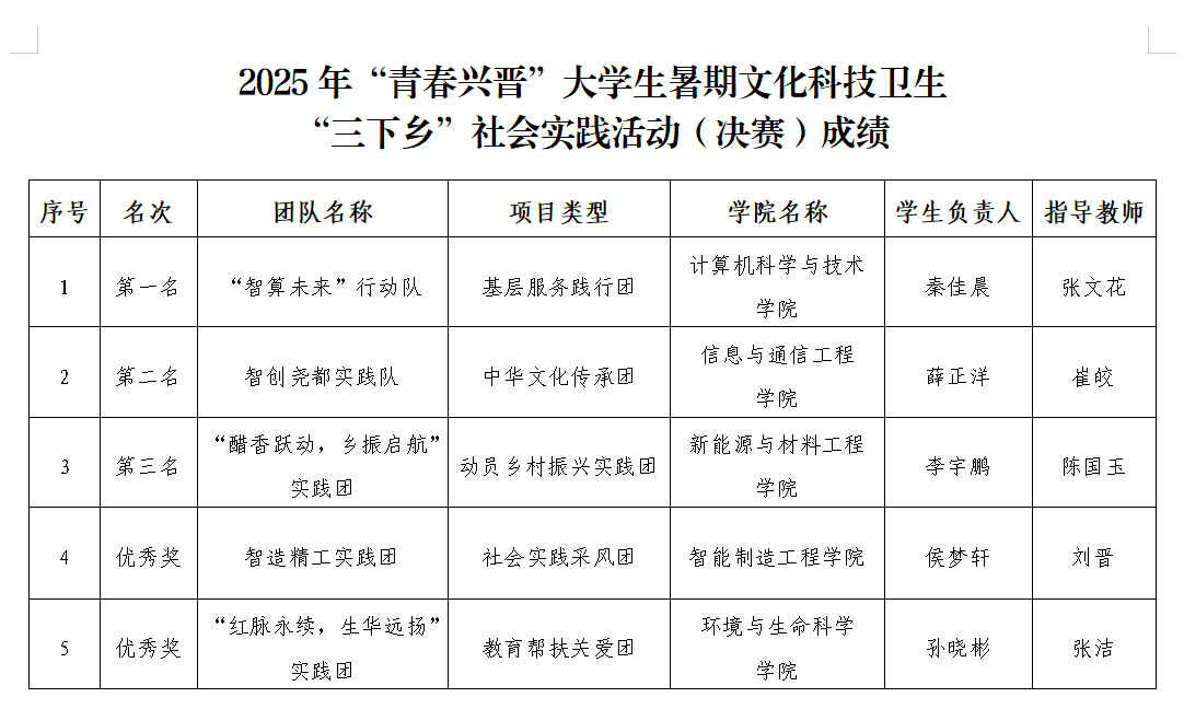 从信息与通信工程学院“智创尧都实践队”携科技之力扎根地方,以技术赋能破解发展难题;到计算机科学与技术学院“智算未来”行动队聚焦数字乡村建设,用智慧算法勾勒乡村振兴新图景;从智能制造工程学院“智造精工实践团”深耕产业升级领域,以精益求精的工匠精神推动制造业迭代革新;到新能源与材料工程学院“醋香跃动 乡振启航”实践团立足传统产业振兴,为老醋非遗注入科技新活力;再到环境与生命科学学院“红脉永续,生华远扬”实践团扛起生态守护使命,让红色基因在绿水青山间代代传承——5支队伍虽深耕领域不同,却始终以青春之名践行责任,用实际行动诠释了“将知识写在祖国大地上、把论文落在实践第一线”的深刻内涵。